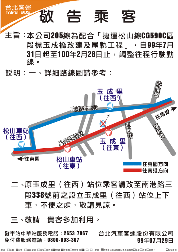 205線為配合「捷運松山線CG590C區段標工程」,自99年7月31日起至100年2月28日止,調整往程行駛動線。