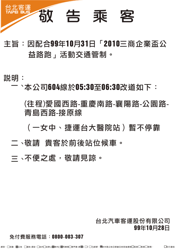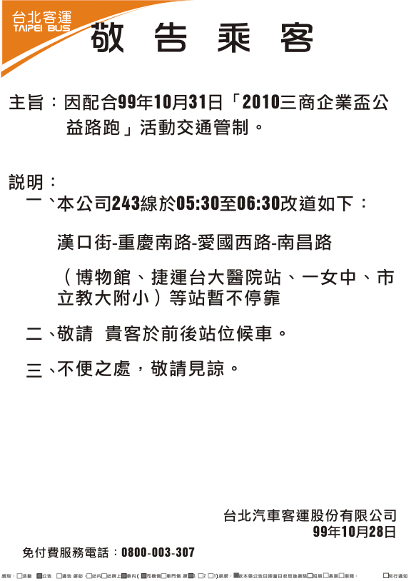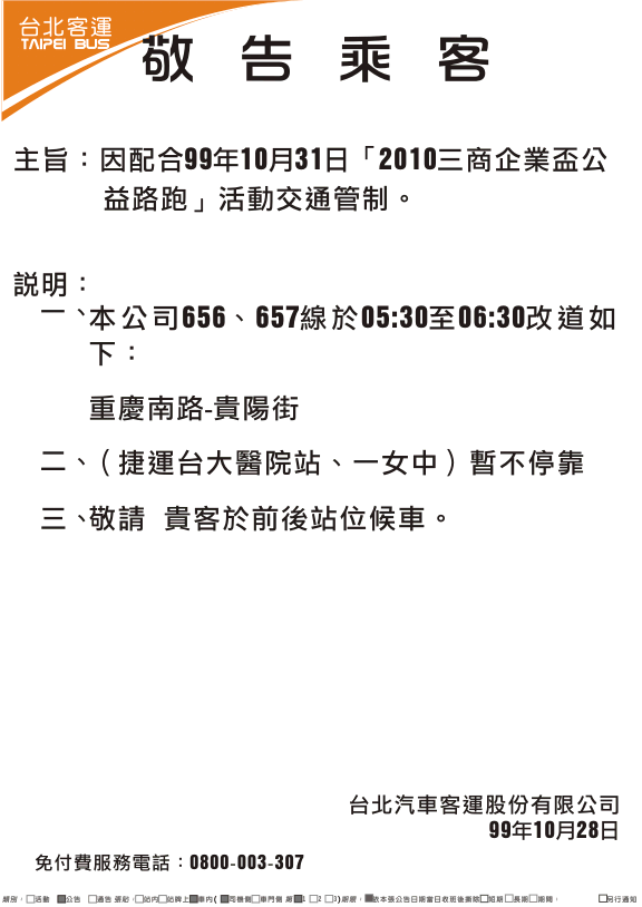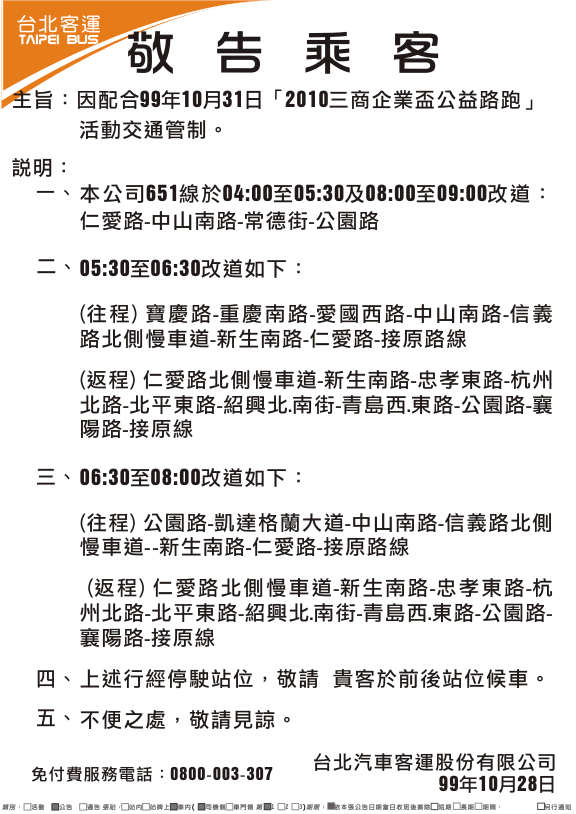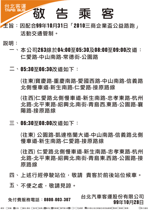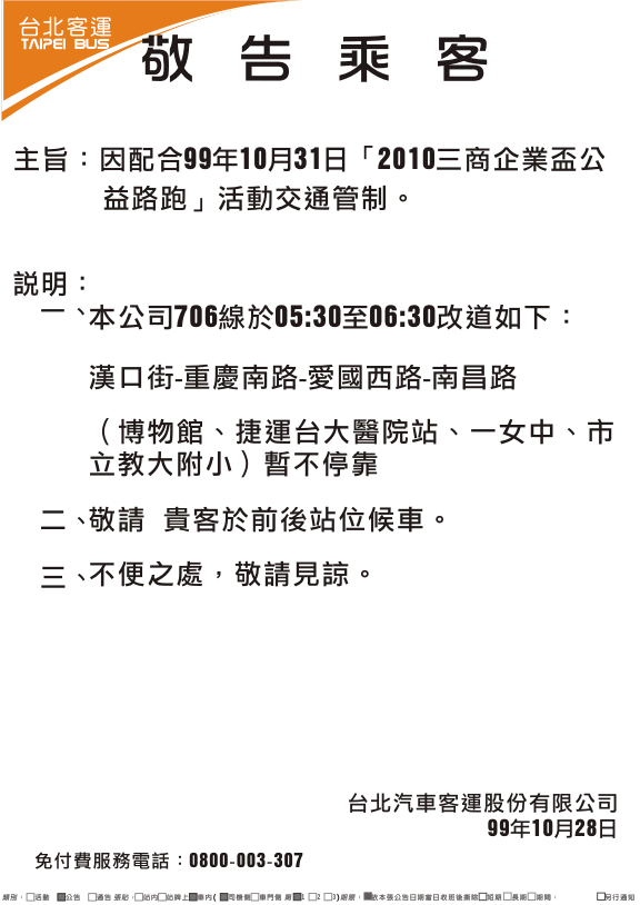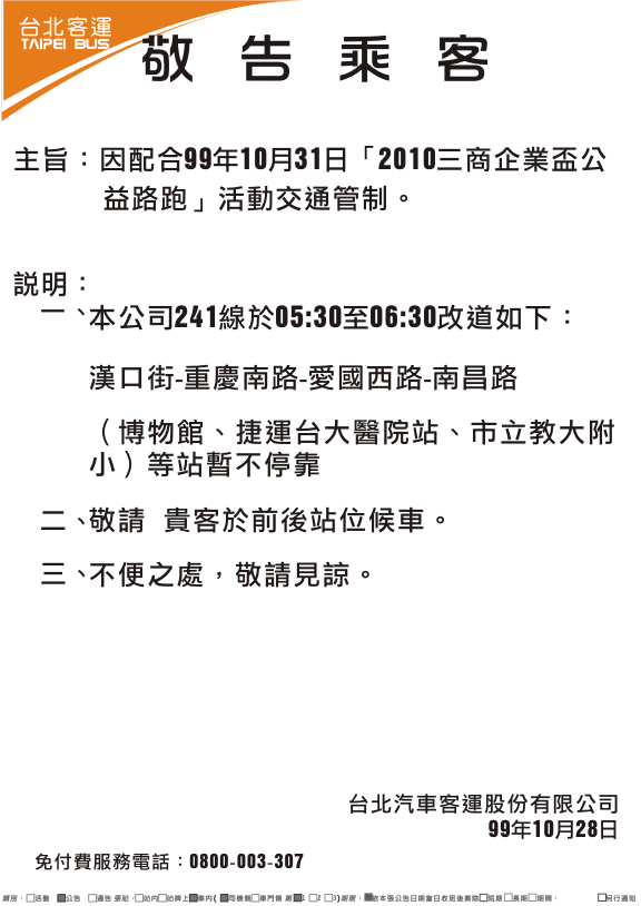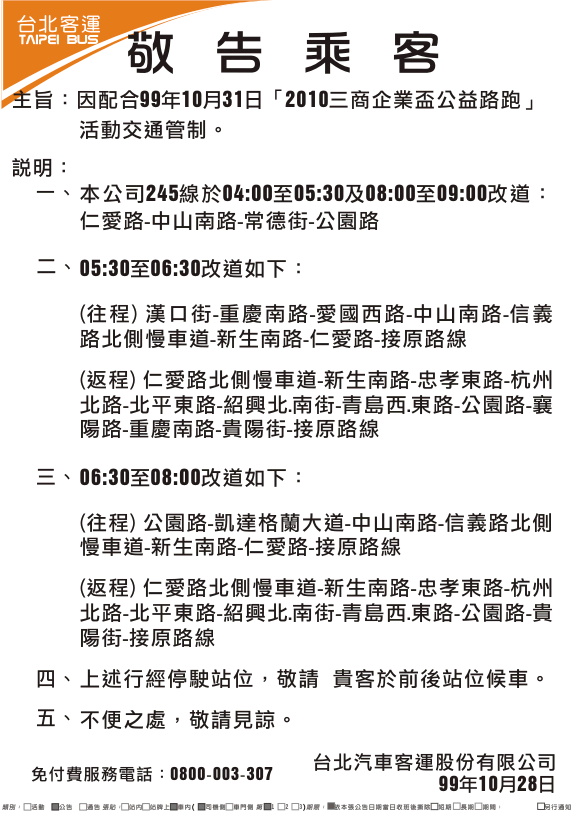 241、243、245、263、651、656、657、706等線因配合99年10月31日「2010三商企業盃公益路跑」活動交通管制改道行駛。