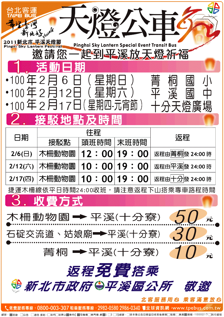 台北客運天燈公車2月6日、2月12日、2月17日為您服務!
