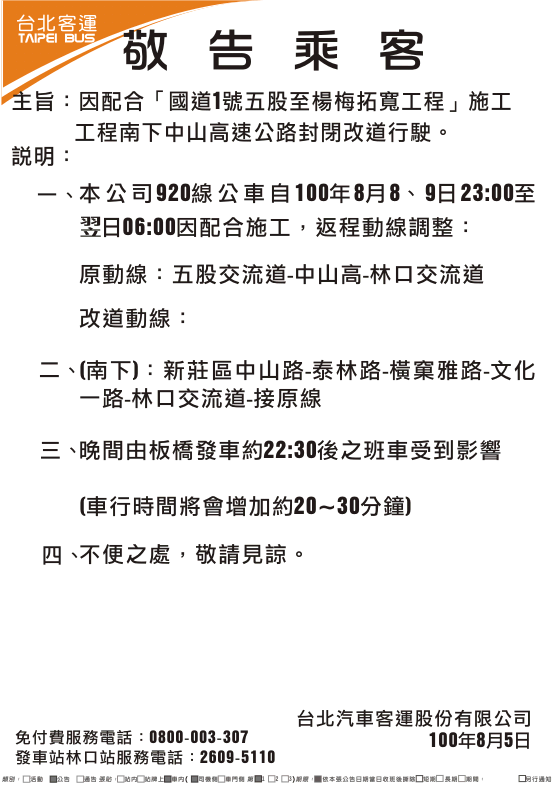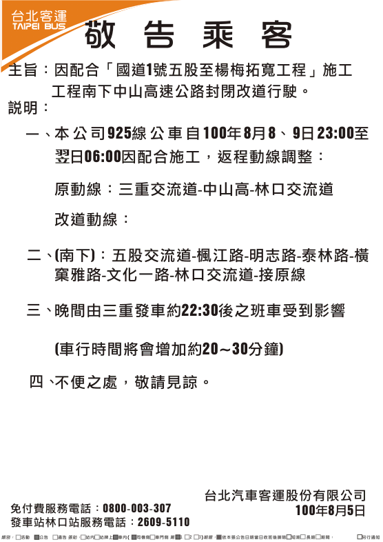 920、925線因配合8月8日「國道1號五股至楊梅拓寬工程」施工工程,南下中山高速公路封閉,改道行駛。