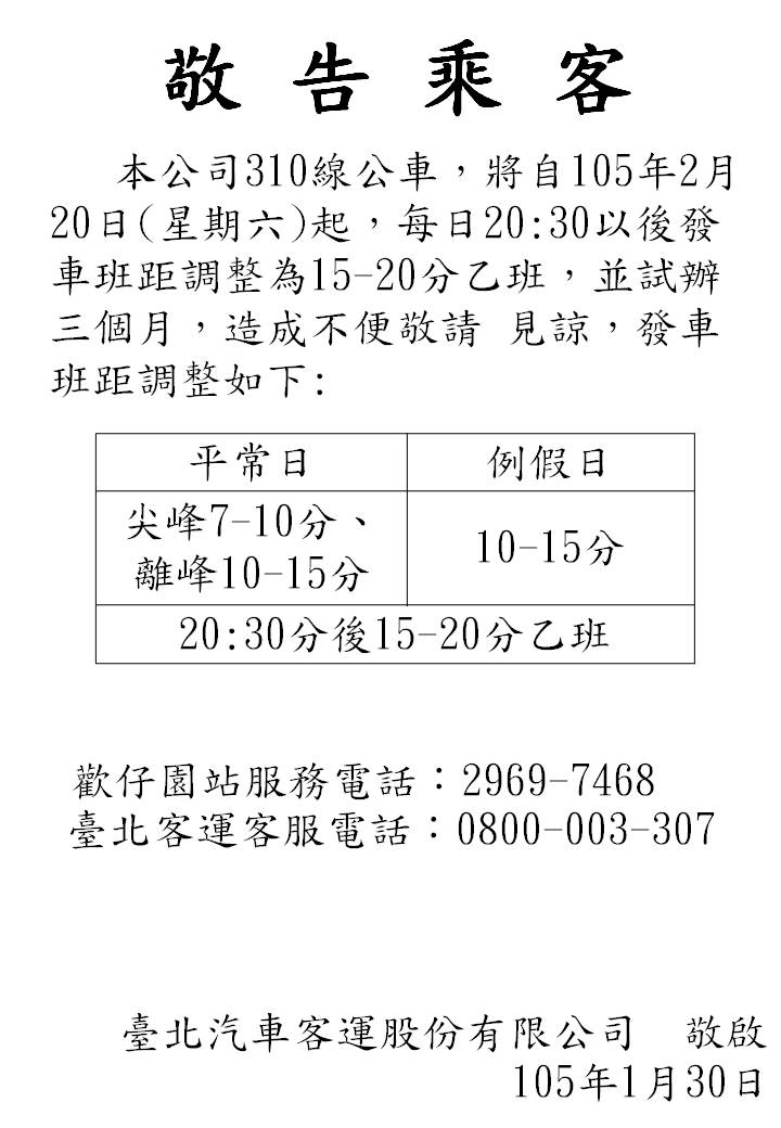 公司310線公車,將自105年2月20日(星期六)起,每日20:30以後發車班距調整為15-20分乙班,並試辦三個月,造成不便敬請 見諒。
