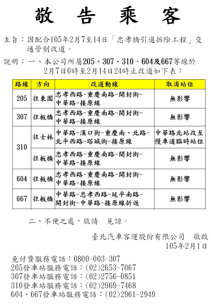 本公司205、307、310、604及667等線班車配合105年2月7至14日「忠孝橋引道拆除工程」交 通管制改道。