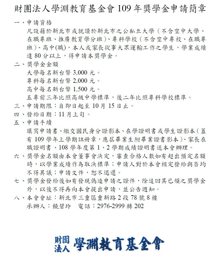 109學年度財團法人學淵教育基金會獎學金申請簡章