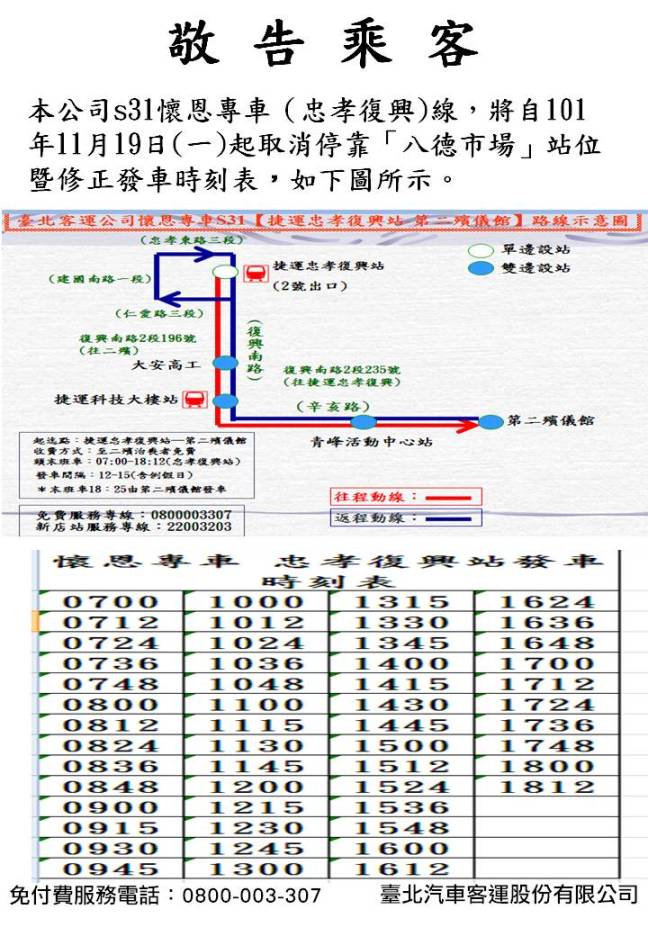 本公司s31懷恩專車(忠孝復興)線,將自101年11月19日(一)起取消停靠「八德市場」站位。