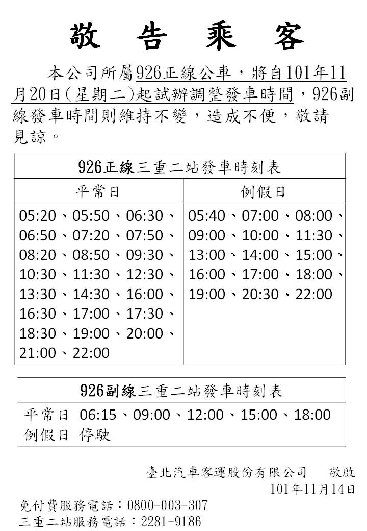 本公司所屬926正線公車,將自101年11月20日(星期二)起試辦調整發車時間。
