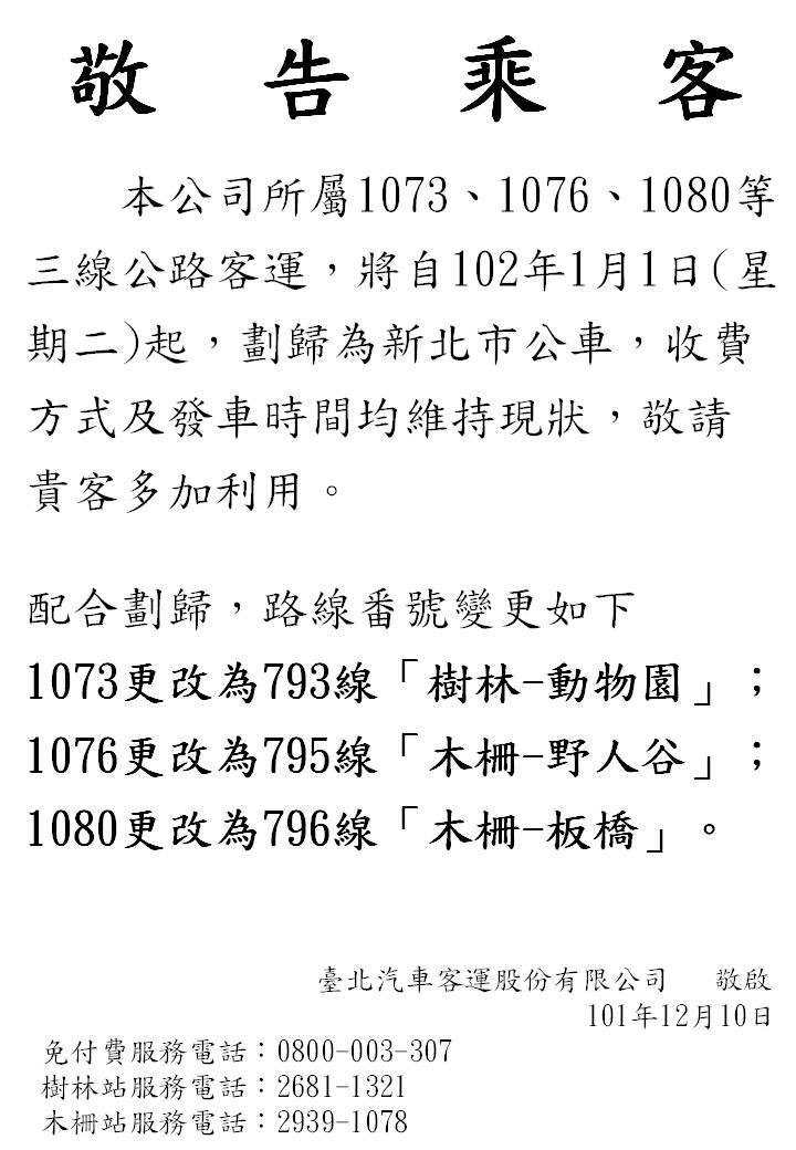 本公司所屬1073、1076、1080等三線公路客運,將自102年1月1日(星期二)起,劃歸為新北市公車。