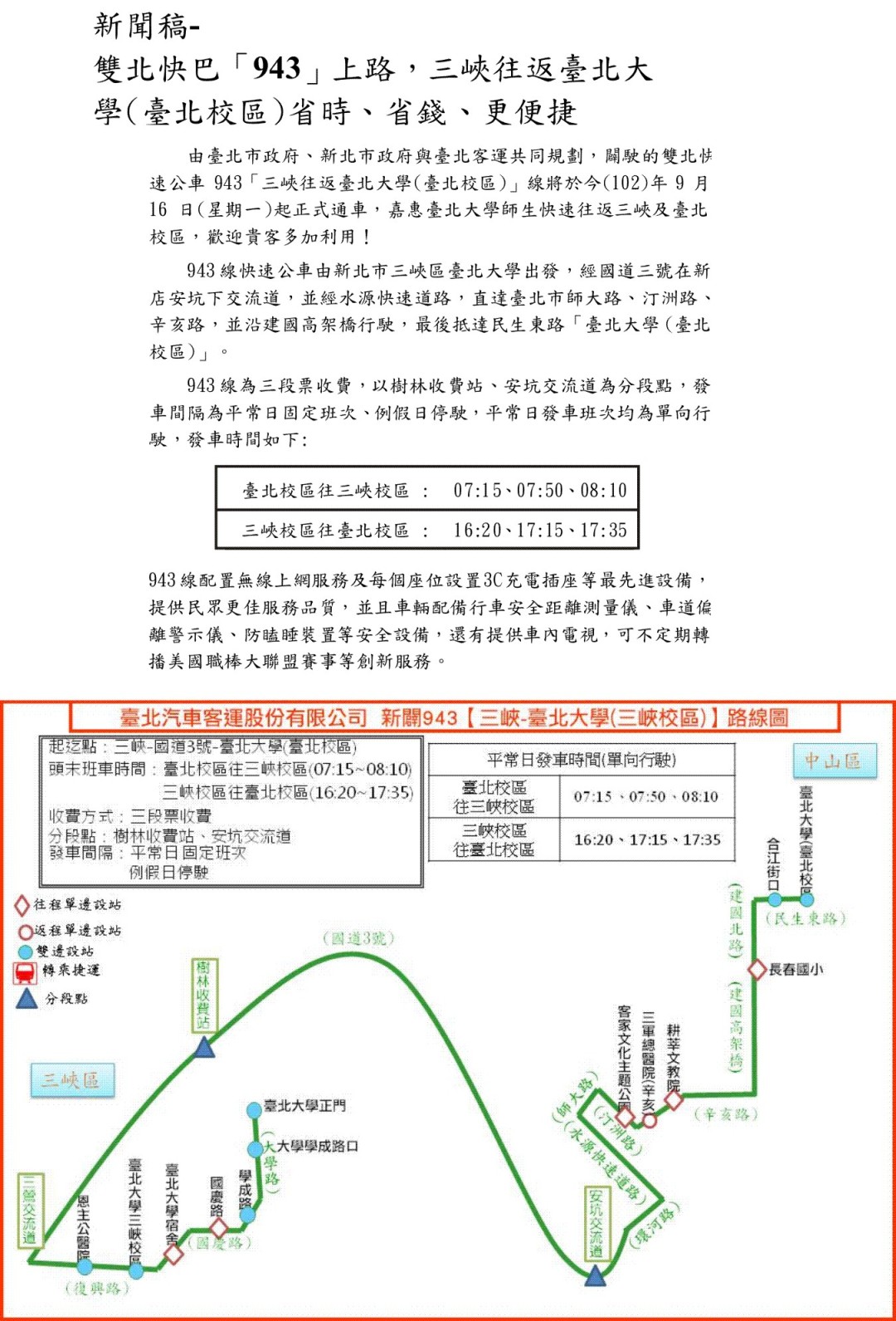 雙北快巴「943」上路,三峽往返臺北大學(臺北校區)省時、省錢、更便捷
