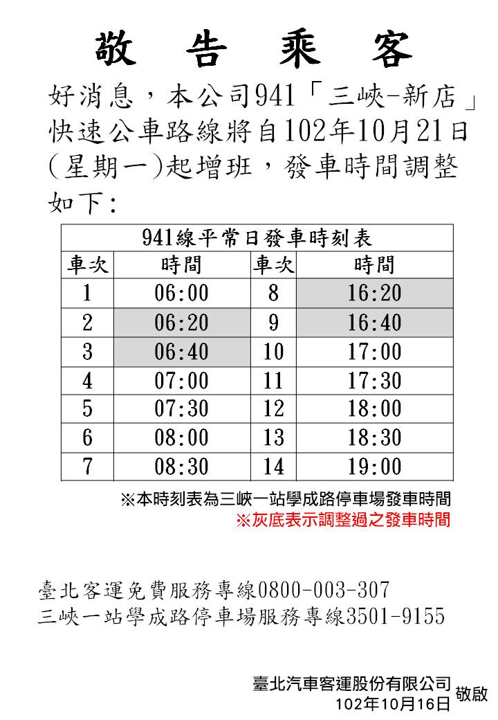 本公司941「三峽-新店」快速公車路線將自102年10月21日(星期一)起增班