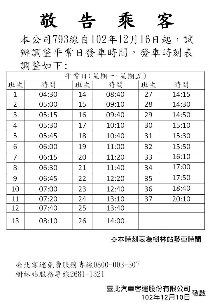 本公司793線自102年12月16日起,試辦調整平常日發車時間。