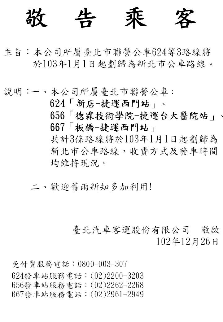 本公司所屬624等3臺北市聯營公車路線將於103年1月1日起劃歸為新北市公車路線。