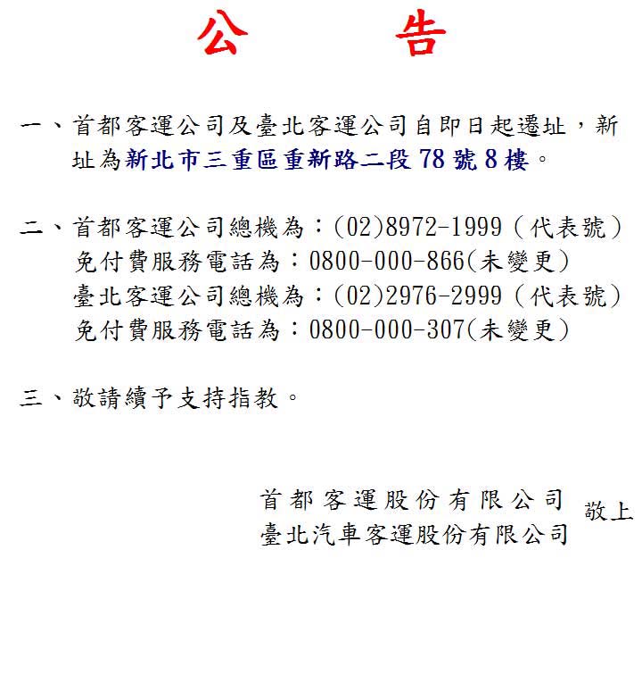 臺北客運客服中心(24小時全年無休)免付費電話:0800-003-307