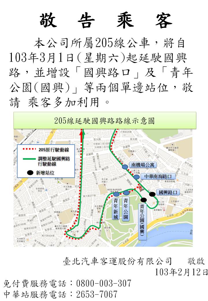 本公司所屬205線公車,將自103年3月1日(星期六)起延駛國興路,並增設「國興路口」及「青年公園(國興)」等兩個單邊站位,敬請 乘客多加利用。